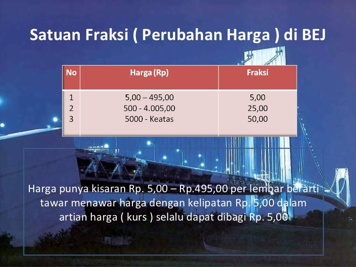 Jual beli saham di bursa efek indonesia (bei) harus sesuai dengan fraksi atau rentang harga yang diperbolehkan bagi investor untuk membeli saham perusahaan yang tercatat dan diperdagangkan di bei. Perubahan fraksi saham ini memiliki konsekuensi tersendiri. Semakin tinggi harga suatu saham, semakin besar pula fraksi yang digunakan.