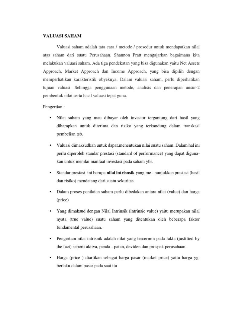 Hal tersebut dikarenakan dengan melakukan valuasi saham kamu akan dapat mengetahui apakah saham tersebut tergolong mahal atau murah. Apa yang dimaksud dengan valuasi dalam berinvestasi saham mengetahui harga suatu saham per lembarnya saja ga cukup. Perhatian, metode ini adalah salah satu metode dari berbagai jenis valuasi saham yang ada yang memperhitungkan dari sisi kuantitatif dan bersifat estimasi, diharapkan investor juga menambahkan beberapa metode yang juga dibahas di web ini sebagai bahan pertimbangan dan juga aspek kualitatif seperti manajemen dan brand dari produk.